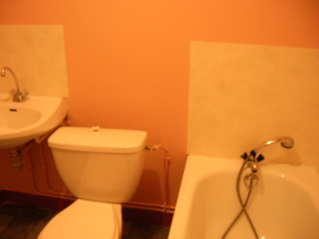La salle de bains a été revue avant sa 1ère mise en location avec des protections sur les murs.